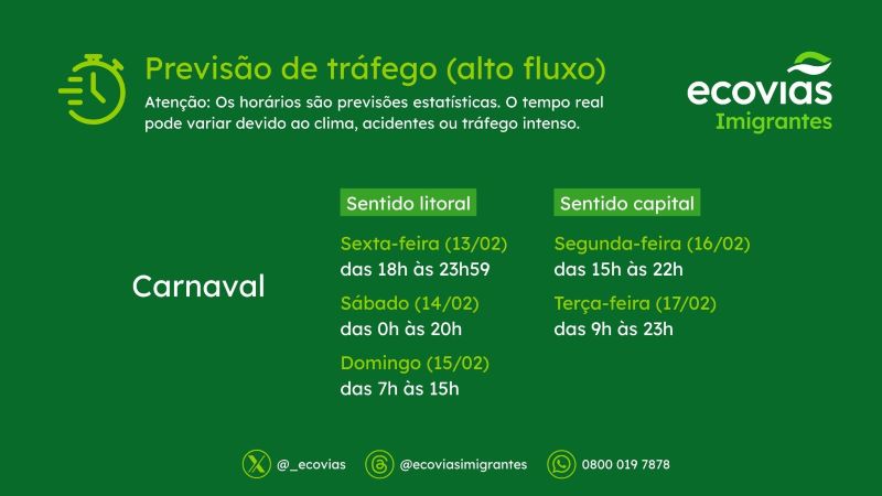 A Ecovias, concessionária do Sistema Anchieta-Imigrantes, estima que entre 290 mil e 446 mil veículos sigam em direção ao litoral entre hoje até a Quarta-Feira de Cinzas (18).